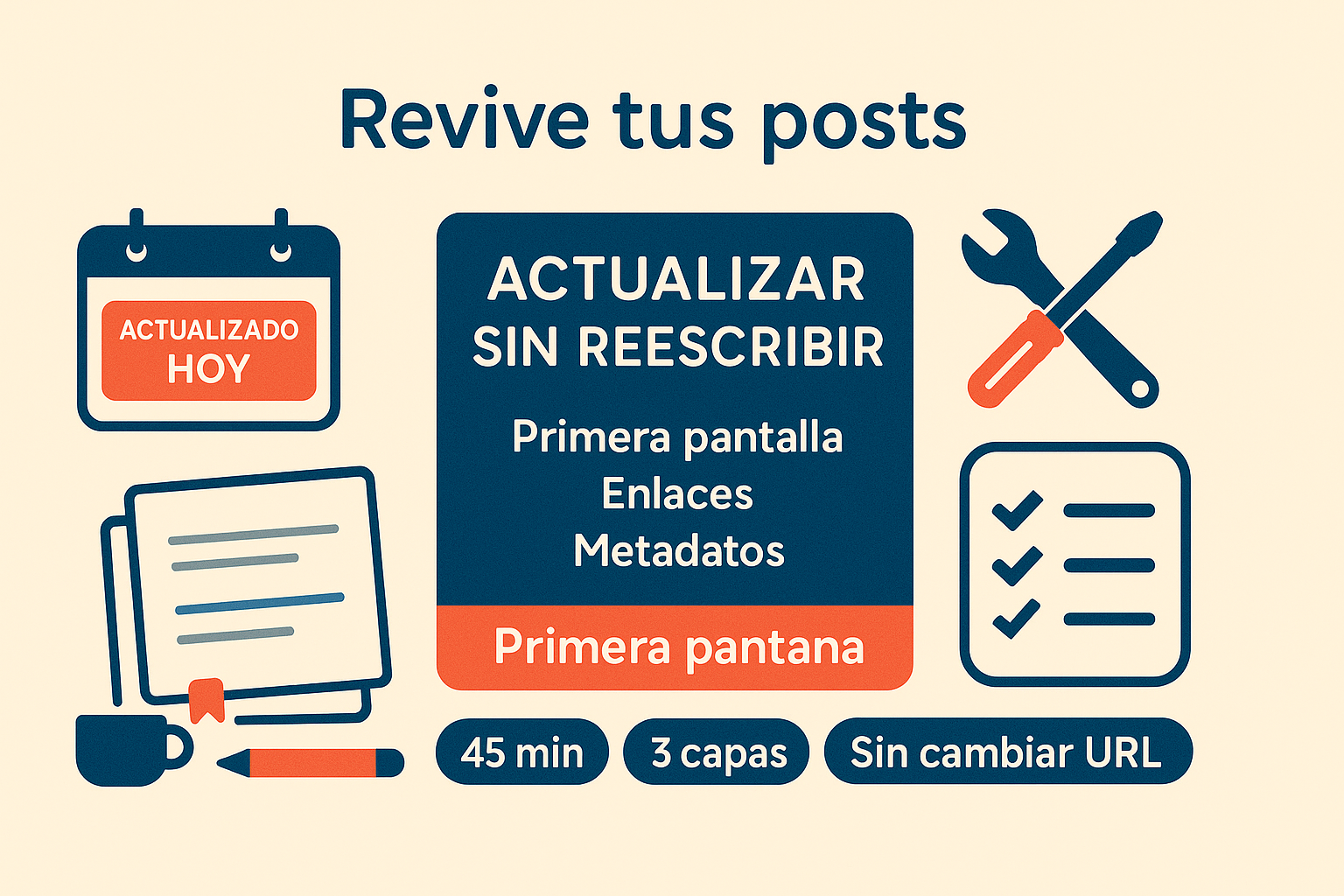 Muchos posts no están “mal”: están pasados. No piden otra vida; piden una ducha, aire y dos ejemplos que huelan a hoy. Actualizar sin reescribirlo todo es una habilidad de mantenimiento que te ahorra horas y devuelve visitas. Con este método por capas de 45 minutos eliges bien qué tocar, lo actualizas con calma y lo dejas listo para vivir un año más. Sin humo, sin dramas, sin romper URL.