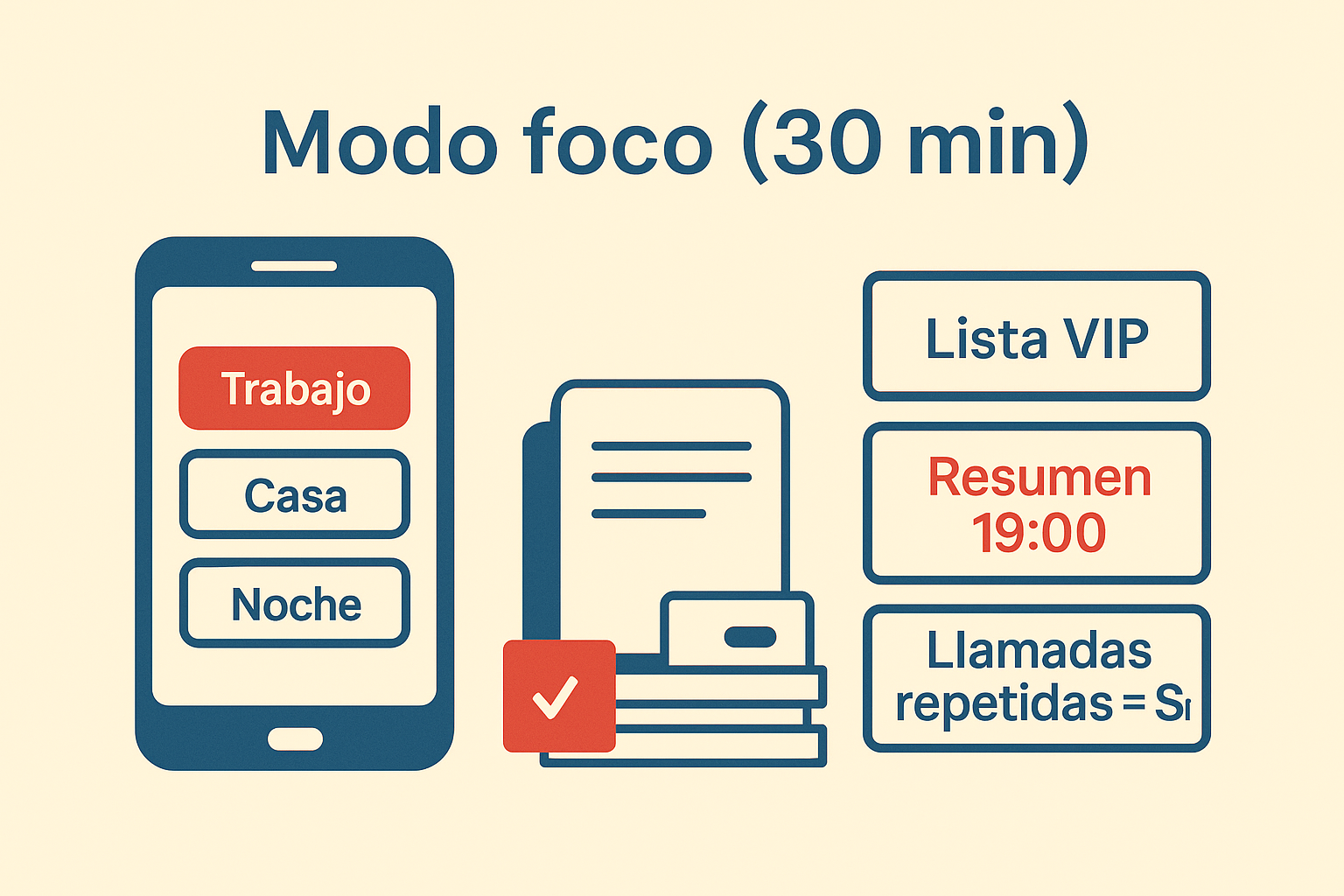 Activas Trabajo. El teléfono vibra sólo si: llega una reunión, te llama alguien de VIP o entra un mensaje del canal que realmente importa. Publicidad, redes y notificaciones de compras se guardan para el resumen de la tarde. La cabeza no se asoma a cada ping, y, cuando miras, hay algo que de verdad requiere tu decisión.