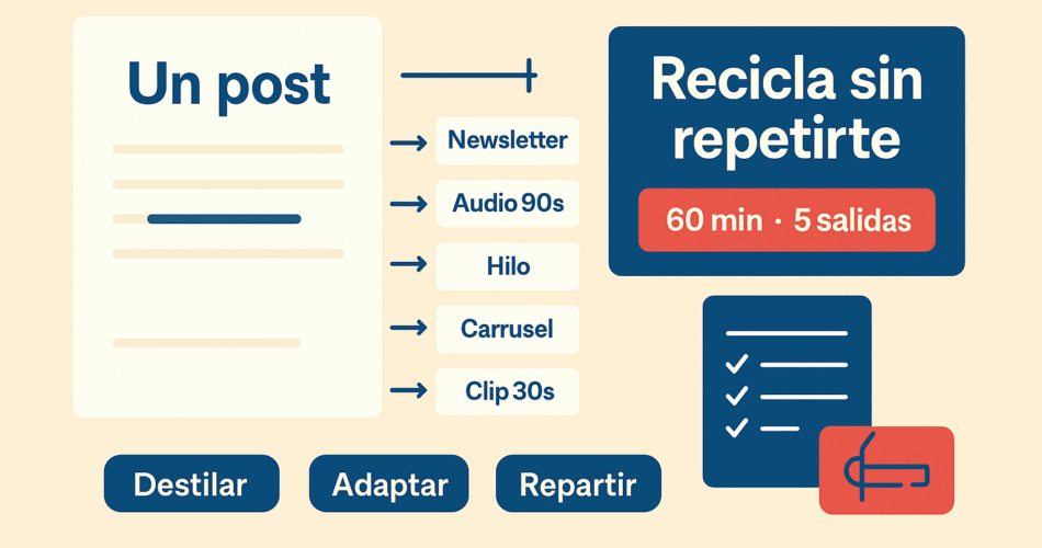 Reciclar no es repetir: es mirar el mismo post desde cinco ventanas distintas. Con un método sencillo de 60 minutos puedes convertir tu artículo de esta semana en una newsletter, un audio de 90 segundos, un hilo, un carrusel y un clip de 30”, sin sonar a copia ni quemar a nadie. No vas a hacer más por hacer; vas a cambiar el formato para que la idea llegue a gente que lee, que escucha o que se desplaza en el móvil con prisa. Hoy te dejo el proceso, los guiones, los tamaños y un calendario amable que cabe en tu semana normal.